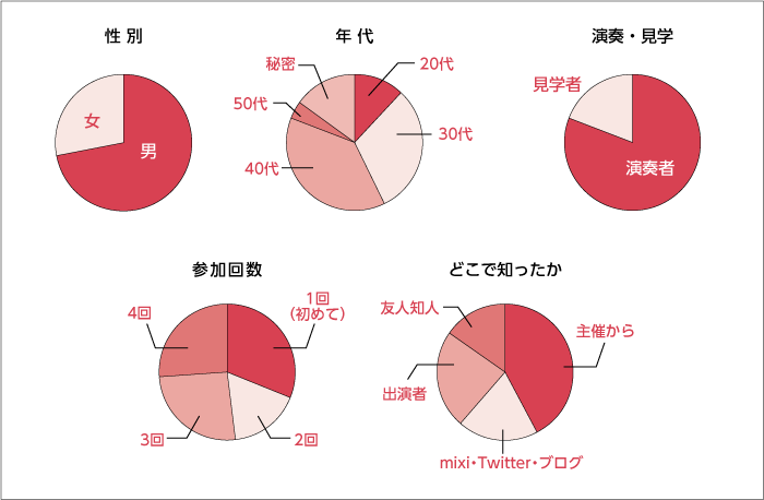 (主催に誘われて/出演者に誘われて/知人・友人に誘われて/主催・出演者のmixi日記やTwitter、ブログ等/ホームページを見て/フライヤーを見て)