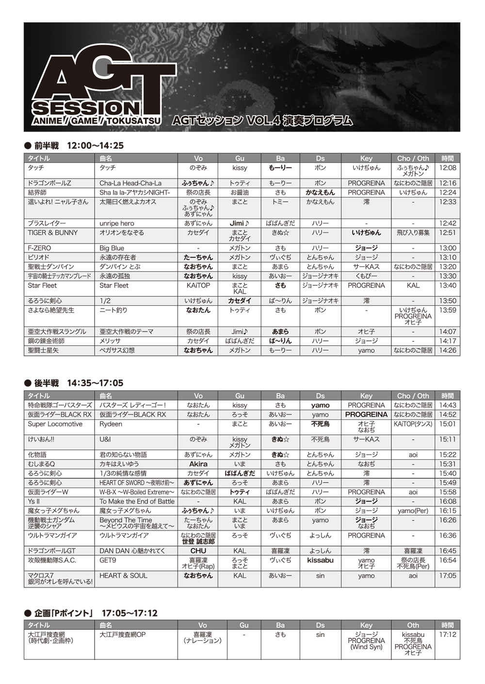 PROGREINAがTwitterで「アニソン、特撮、ゲーム限定セッションしたいなぁ」とつぶやく。これに不死鳥(主催その3:Dr)、kissabu(主催その4:Dr)が賛同し、本格的に企画が成立。